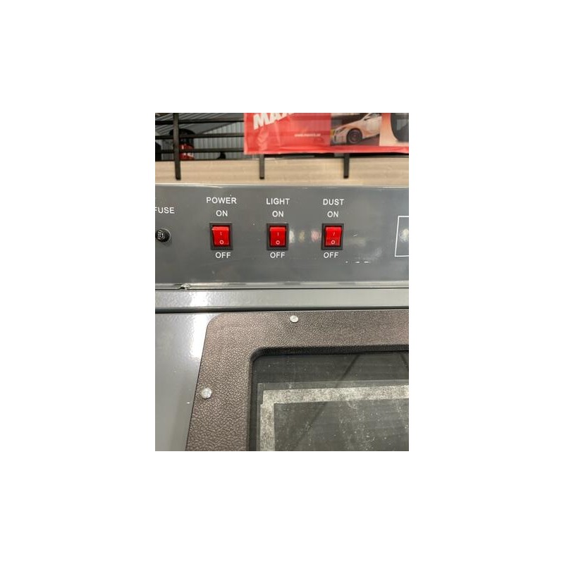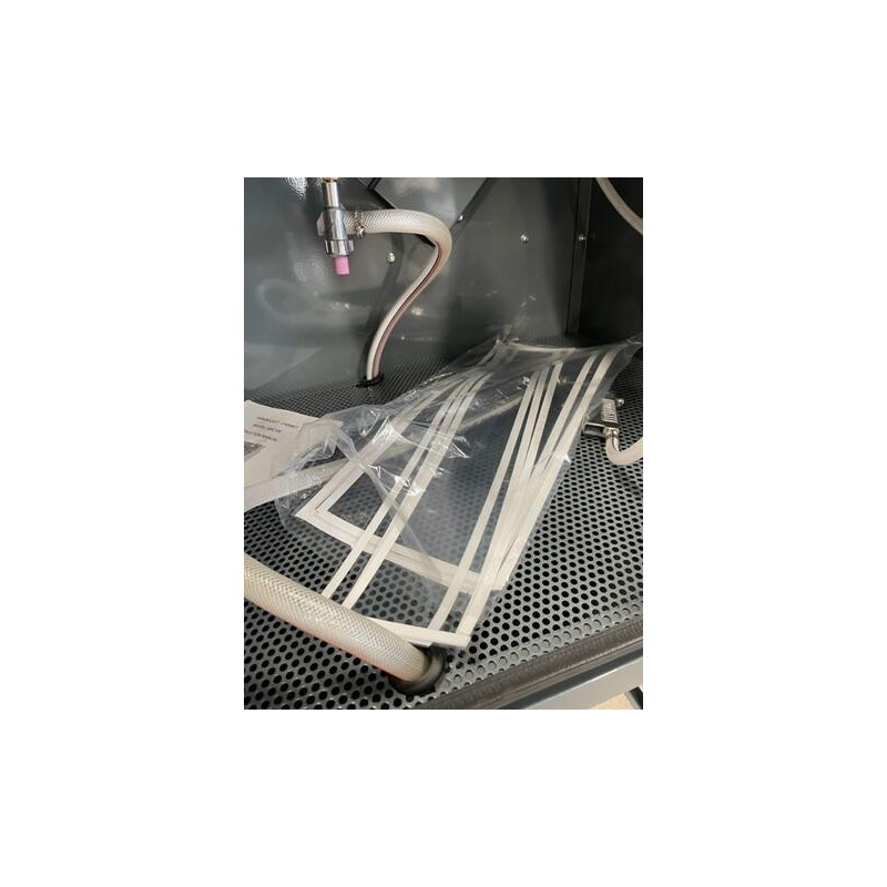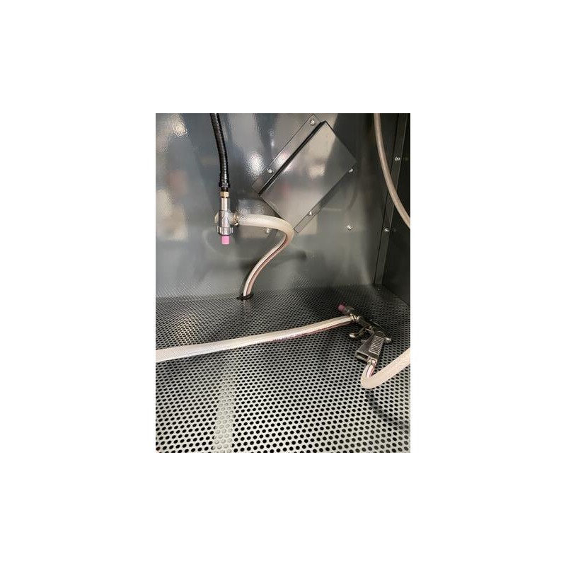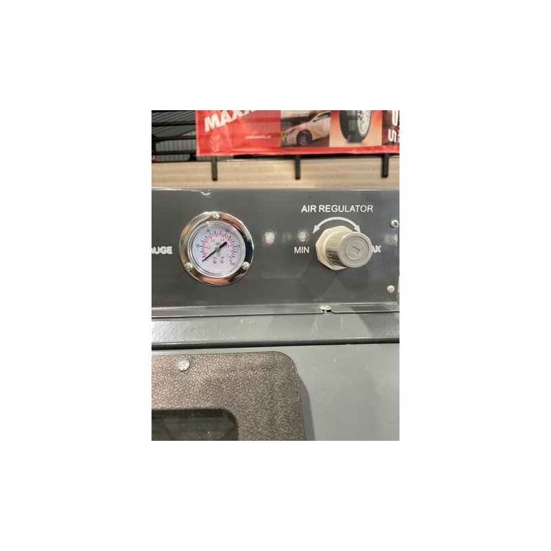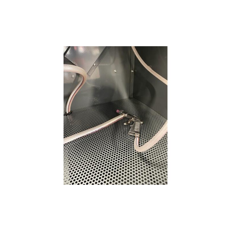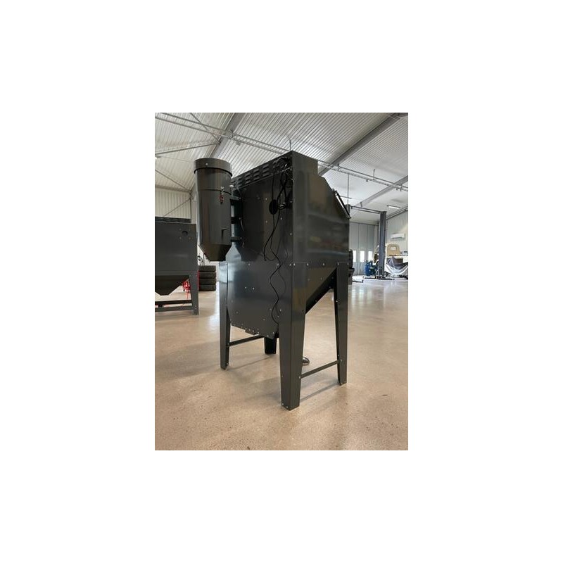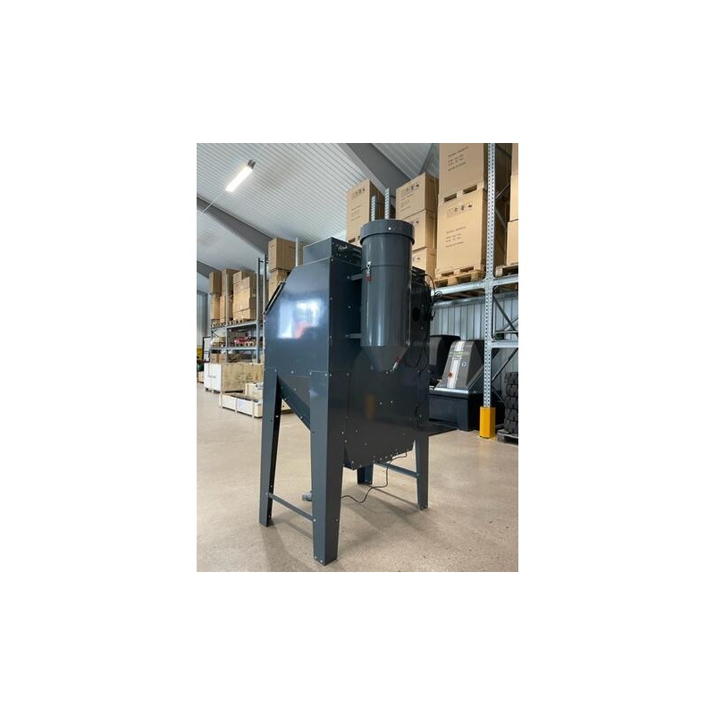 Blästerskåp med utsug av golvmodell. Försedd med 2 stk blästerpistoler. En för fotpedalsstyrning och en för manuell körning. Försedd med öppningsbar front belysningsutrustning med 2stk 20W lysrör, reduceringsventil med inbyggd manometer, blästerhandskar i naturgummi/vinyl samt utsugstält med inbyggt partikelfilter.